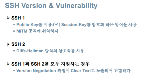 * 본 게시물의 내용은 수업에서 배운 것을 정리한 것이므로 악용해서는 안됩니다. 게시된 내용들은 잘 알려져있는 기술들입니다. 따라서 악용하더라도 쉽게 적발되니 절대 악용해서는 안됩니다.------------------------------------------------------------------------------------------------- SSH MiTM Attack SSH2도 얼마전에 뚫렸다고 한다. SSH3가 나오지 않을까 중간에 MITM 환경을 만들어 버전 1을 사용하게끔 유도 하는 공격이 가능하다. SSH v2 제외하고는 공격 대상이 된다. 공격 과정은 아래와 같다. 동작 방식이 어떻게 되는지 살펴보겠다. vi /etc/ssh/sshd_config 15번째 줄 Protocol 1..